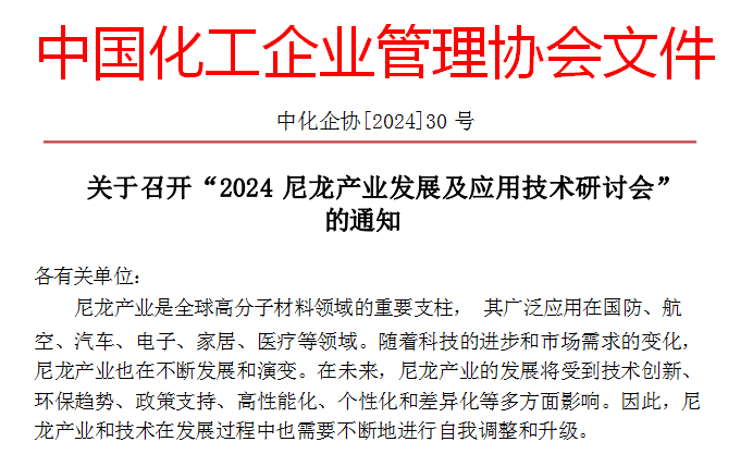 关于召开“2024 尼龙产业发展及应用技术研讨会” 的通知